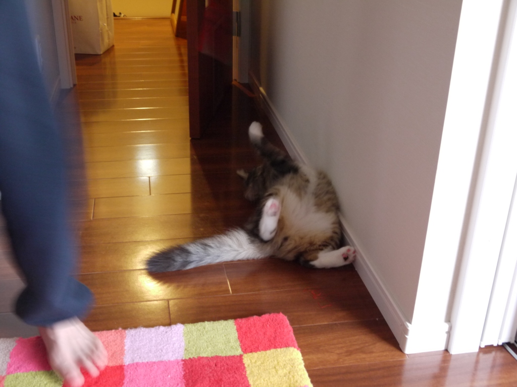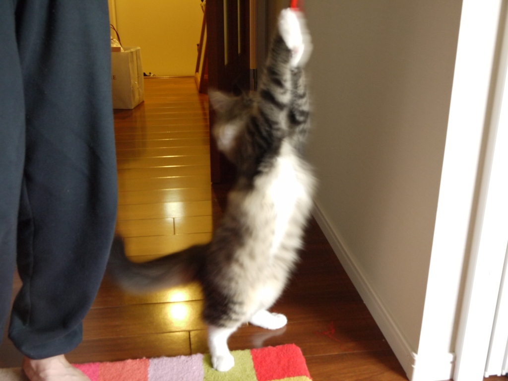 ダンナがリボンでレオをじゃらしています