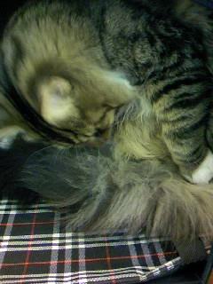 ↑ 帰りの車中で 毛づくろいに専念するレオ