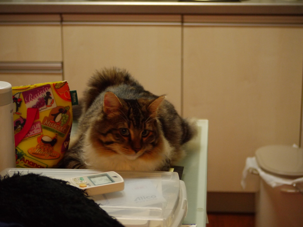 部屋を出た後を追跡したら キッチンのテーブルに乗っていました