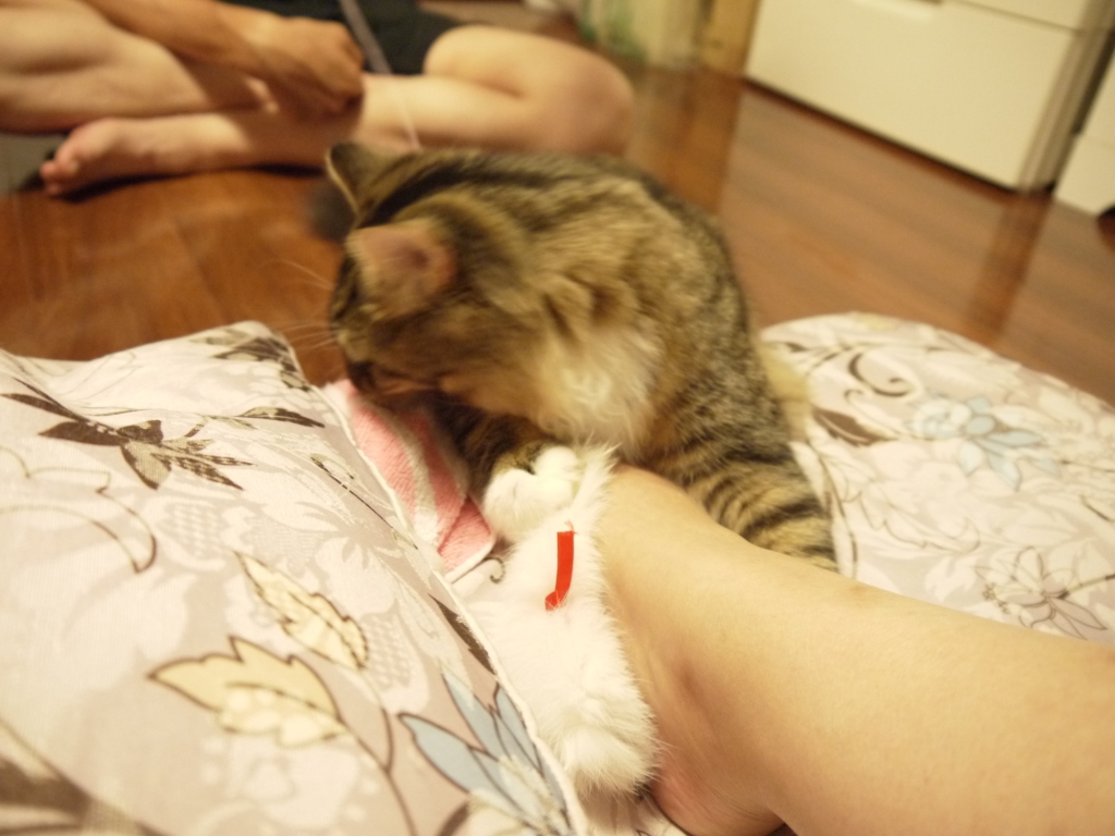 昨日はおもちゃごとおねーさんの足をつかんでたクセにさ